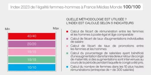 En 2023, France Médias Monde obtient le score maximal de 100 points sur 100. Le groupe fait ainsi partie des 2% d’entreprises françaises atteignant ce résultat.