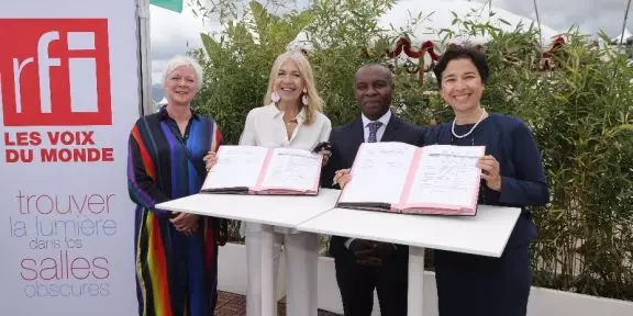 Marie-Christine Saragosse, Présidente-directrice générale de France Médias Monde, et Eva Nguyen Binh, Présidente de l’Institut français, ont signé le vendredi 16 mai sur le Pavillon Les cinémas du monde au Festival de Cannes en présence de Thani Mohamed Soilihi, ministre délégué chargé de la Francophonie et des Partenariats internationaux, une convention de partenariat pour la production d’une série de podcasts RFI «Cinéastes d’Afrique», qui sortira à l’automne 2025.