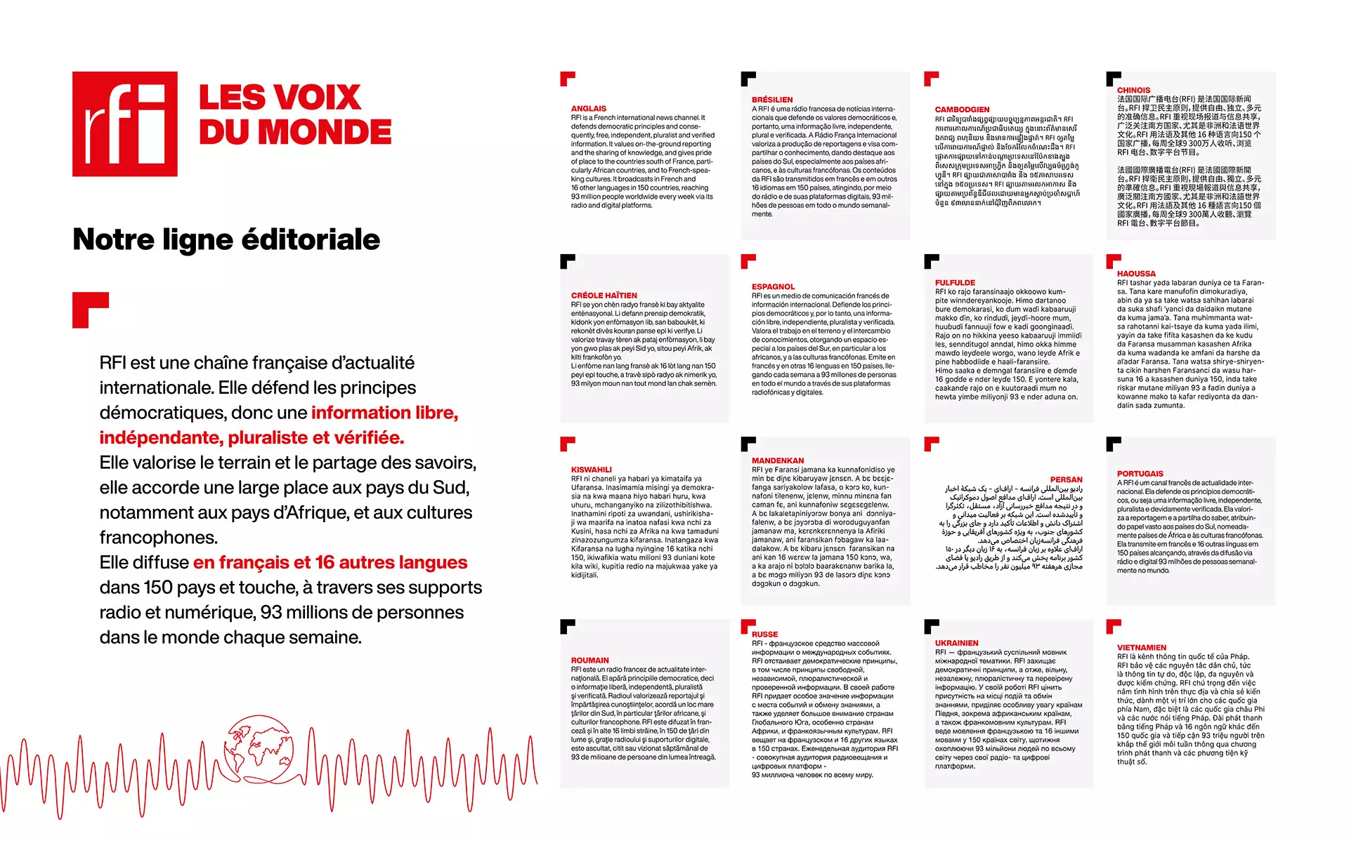 Radio française d’actualité mondiale, RFI est diffusée sur les 5 continents en français et dans 16 autres langues, à travers 134 relais FM et DAB+, en ondes courtes, sur une trentaine de satellites, sur Internet et de nombreuses applications connectées. Elle compte également plus de 1 800 radios partenaires qui reprennent ses programmes partout dans le monde.